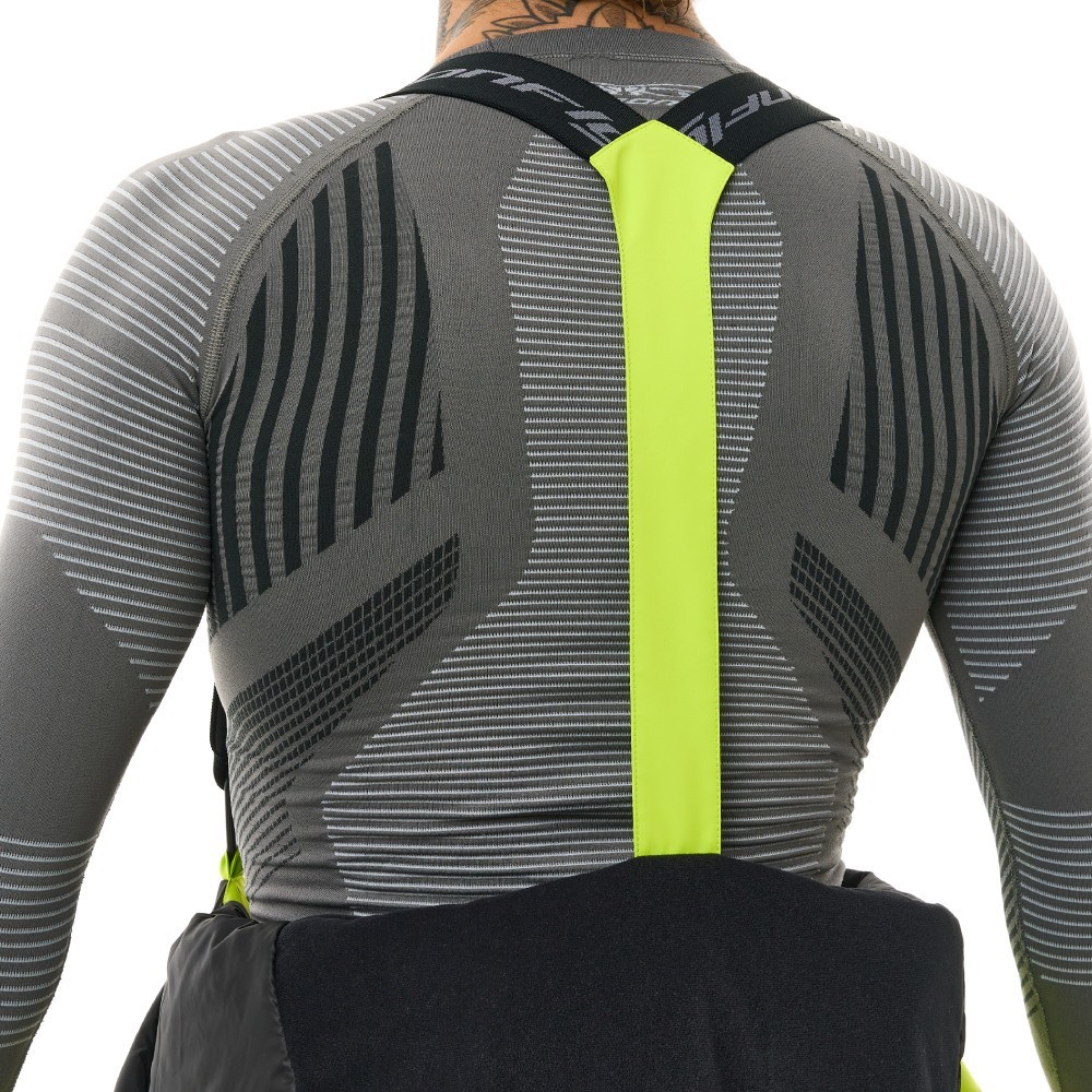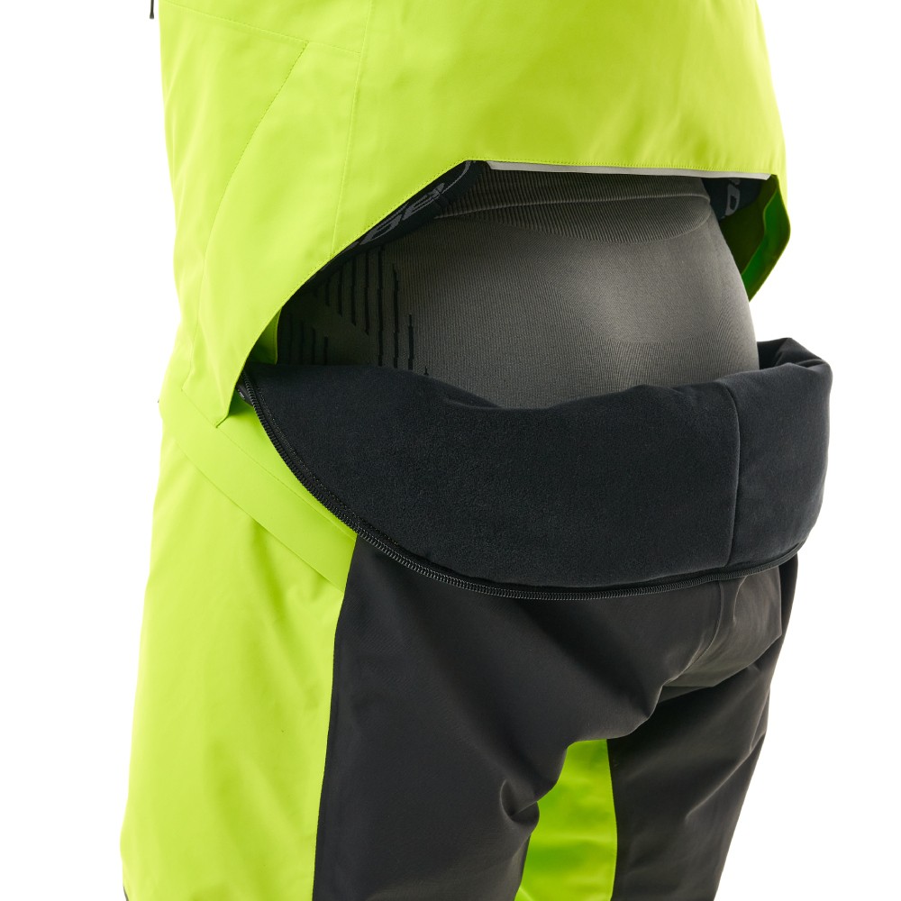 - Поперечная молния в нижней части спины ("бомболюк") позволяет легко и быстро открыть низ, не снимая при этом весь комбинезон. Молния укрыта внешним и внутренним клапаном.