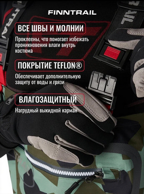 - Все швы и молнии проклеены, что помогает избежать проникновения влаги внутрь костюма.