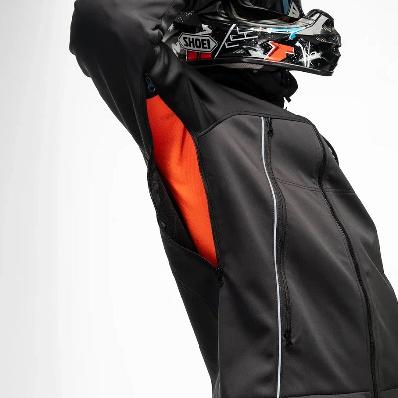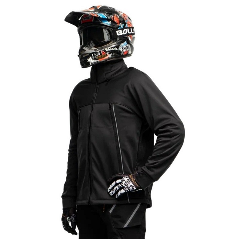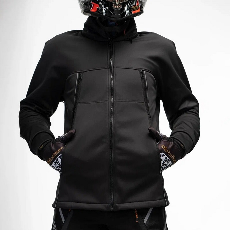Материал куртки хорошо тянется и не сковывает движения. Внутри воротника спрятан тонкий капюшон, который можно надеть прямо под шлем.