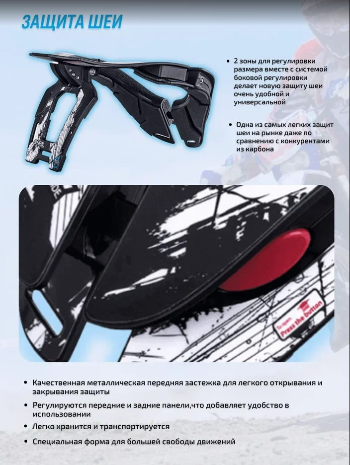 - 2 зоны для регулировки размера вместе с системой боковой регулировки делает новую защиту шеи очень удобной и универсальной