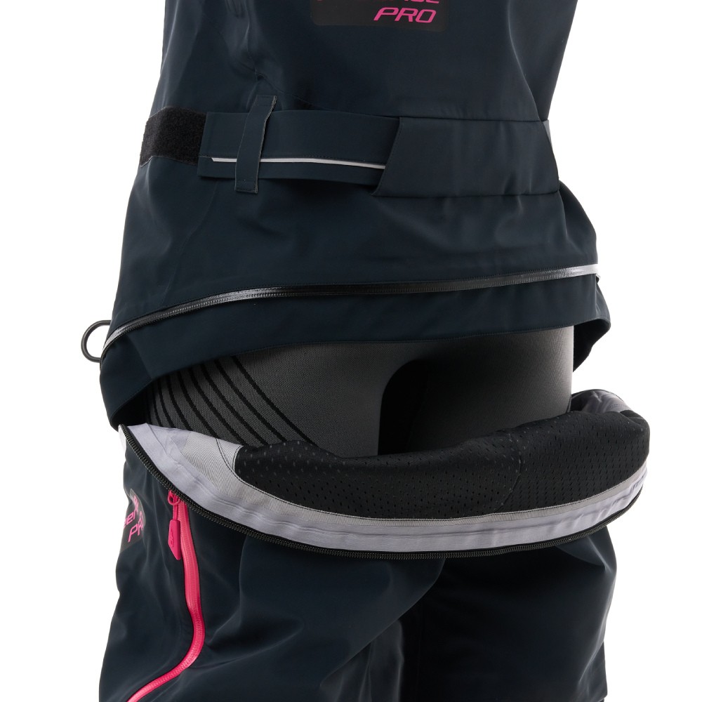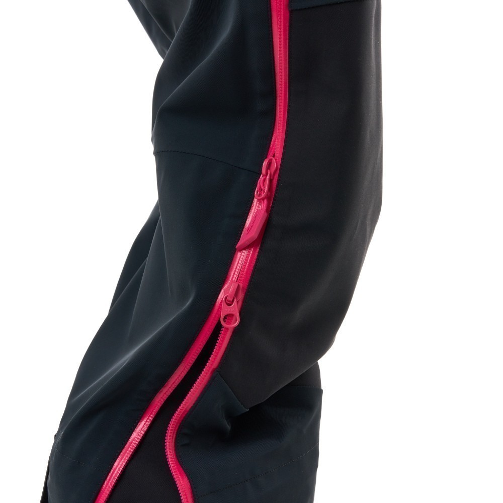 Эргономичный крой не ограничивает свободу движений. Безупречная посадка обеспечивается кроем деталей на лазерной установке (исключены ошибки ручной резки). Герметичность комбинезона обеспечивается минимальным количеством швов. Часть молний и элементов вклеены (нет лишней толщины в местах установленной фурнитуры), все остальные швы полностью герметизированы трехслойной термолентой. Все внешние молнии – влагозащитные YKK. Комбинезон сшит высокопрочными нитками. Задняя часть комбинезона утеплена софтшеллом.