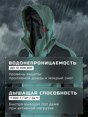 - Высокая водонепроницаемость: 12 000 мм (дождь/ мокрый снег).