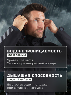 - Высокая водонепроницаемость: до 17 000 мм. (сильный длительный ливень, мокрый снег).