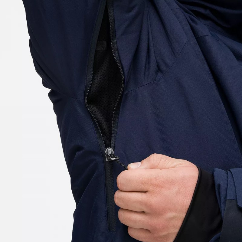 - Вентиляционные отверстия в области подмышек поддерживают комфортный микроклимат и снабжены влагозащитными молниями и внутренней сеткой для защиты от попадания снега внутрь.