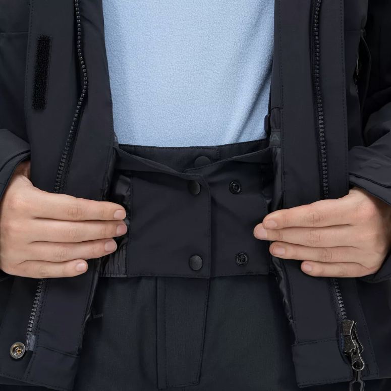 - Снегозащитная юбка препятствует попаданию снега под куртку при падении и обеспечивает дополнительную защиту от холода.