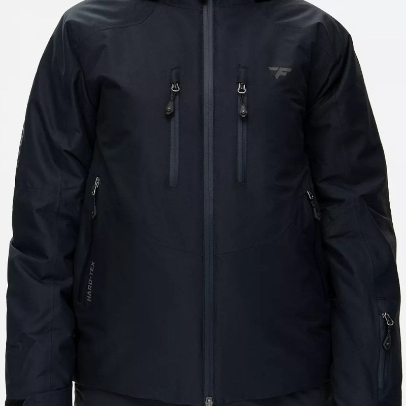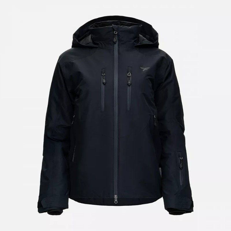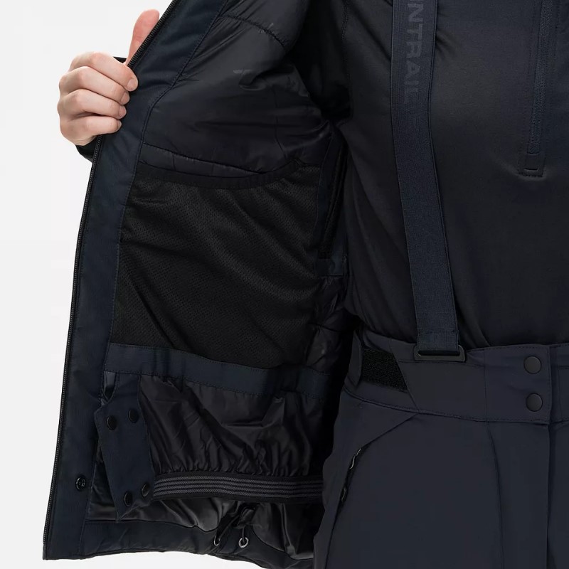 - Пять внешних карманов с влагозащитными молниями: два вместительных боковых с тёплой подкладкой из мягкого микрофлиса, два нагрудных и один на рукаве для ски-пасса.